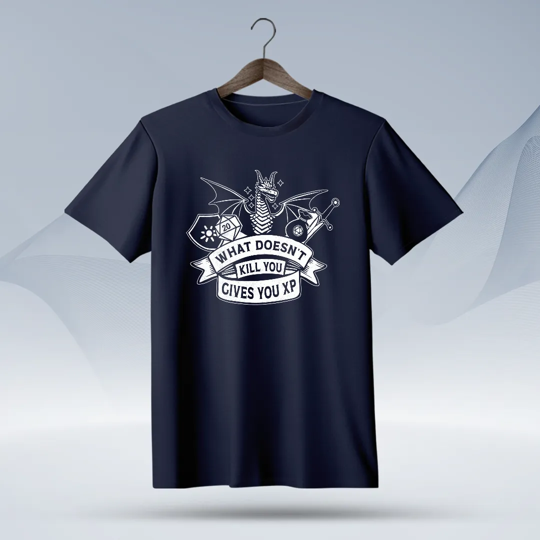 The What Doesn’t Kill You Gives You XP T-Shirt by ModeRave is a must-have for RPG players who love to level up and gain experience points from every challenge they face. Featuring a funny and relatable quote, this shirt celebrates the resilient spirit of gamers and their love for tabletop adventures.
